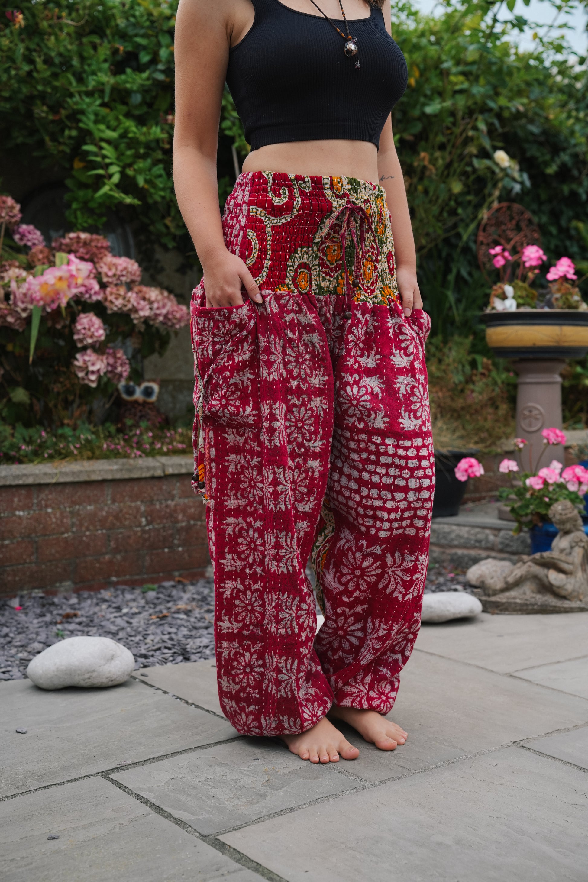 Vintage Kantha Harem Pants. With a soft shirred waist, elasticated ankles and side pockets.