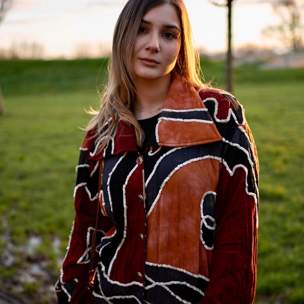 There is a Large collar, large cuffs, the beautiful batik is edged in iridescent sequins which are just stunning.