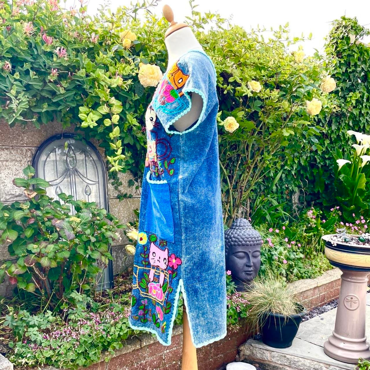 Each dress takes months to complete, it is hand embroidered on the front with cats in teacups and flowers. The dress is edged with crochet and so are the pockets. The dress is plain on the back with 2 shades of blue using 100% Cotton / denim Vintage fabric.